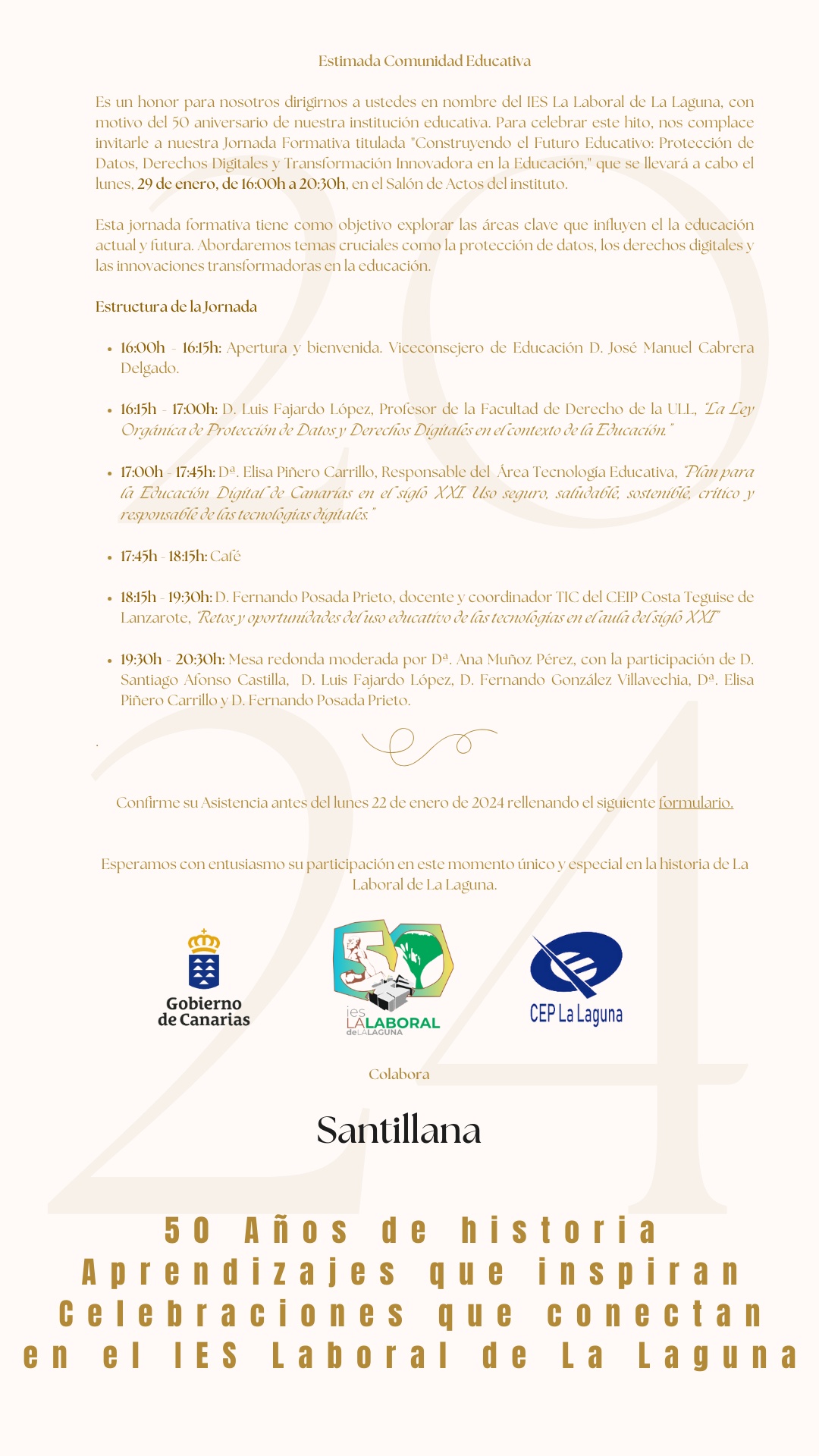 Charla de Luis Fajardo, de EDUCATIC, en las jornadas "Construyendo el Futuro Educativo: Protección de Datos, Derechos Digitales y Transformación Innovadora en la Educación", celebradas en el IES La Laboral, La Laguna. También Luis Fajardo participa en la posterior mesa redonda. Mas info ...